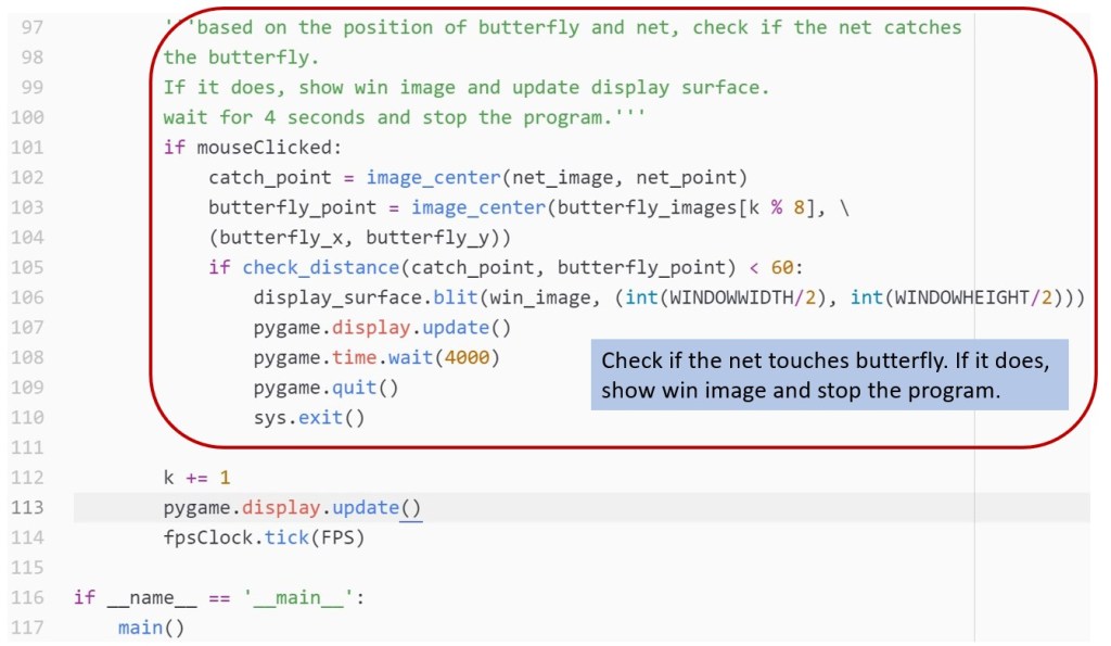 Here, you might have noticed the difference between Scratch game and Pygame. In Scratch, distance between two sprites has corresponding programming block “distance to”. The image center is the “x position” and “y position” of the sprite. What we need to do is just to use those blocks directly. While in Pygame, you need to write your own functions to implement those stuff.