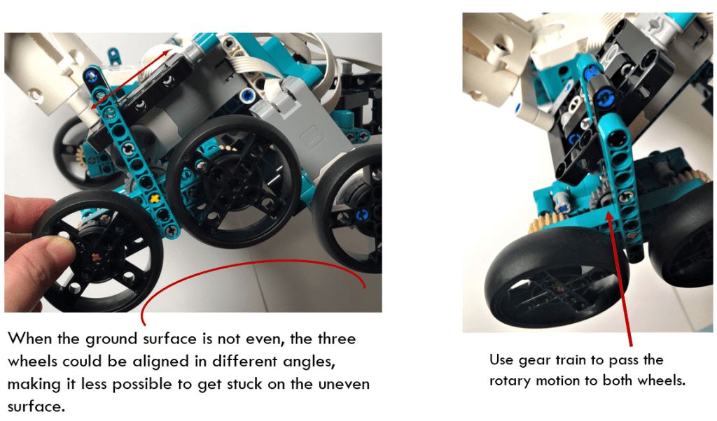 The two motors are set up in a shape of triangle. Such a creative structure ensures to have a suitable distance between front and back wheels. Meanwhile, the tilted surface makes possible for the back wheels to glide and sway in the slot of frame. When the ground surface is uneven, this structure could avoid the rover from getting stuck.