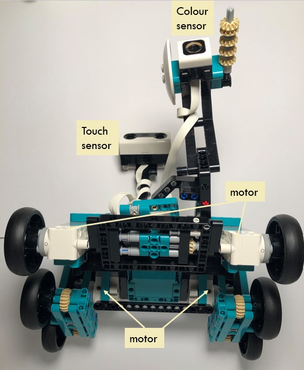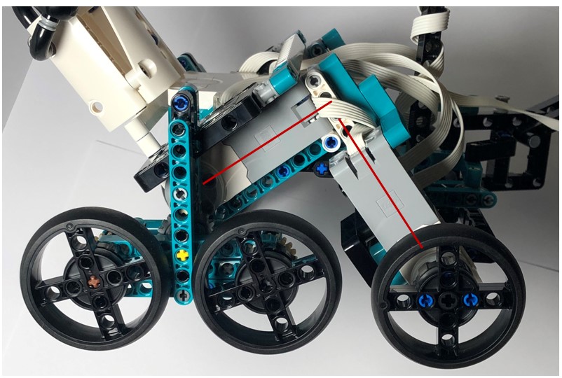 This model is pretty big and heavy. Its body is widely stretched and symmetric. The smart hub is put in the center. There are four motors used in this model. Two front wheels are driven independently. The other two motors control four back wheels, with each controlling two wheels. Color sensor is attached to one front arm, while ultrasonic sensor is attached to the other standing pole.