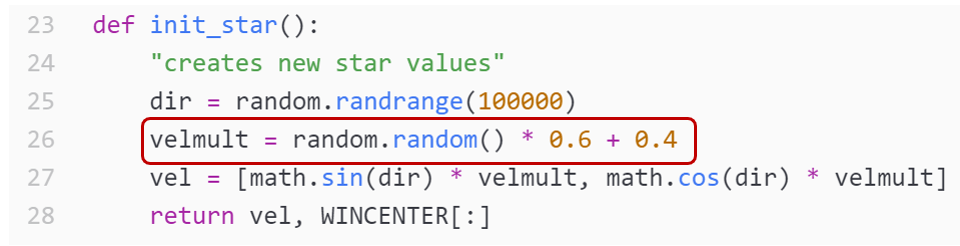 From line 23 to 28, the program defines a method called “init_star()”. This function is used to generate two random values through random module. One random value is “dir”, and the other is “velmult”. They work together to generate list “vel”, which represents the velocity in y and x direction, respectively.