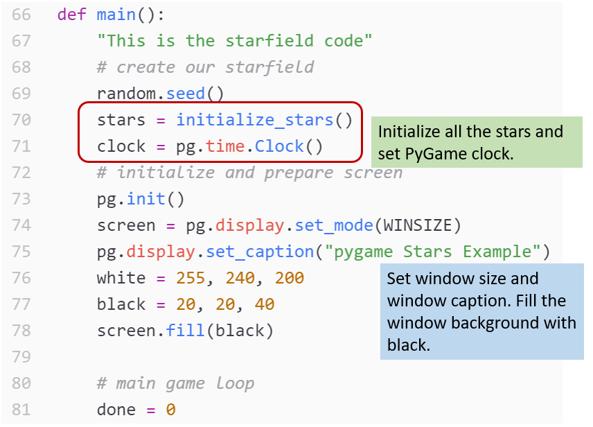 From line 66, the program defines “main()” function, which wraps all the stuff together to make the game run. From line 69 to 81, it calls function “initialize_stars()” to initialize all stars’ position and blits them to main surface. Like other PyGame projects, it also sets window size, window caption and window background color.