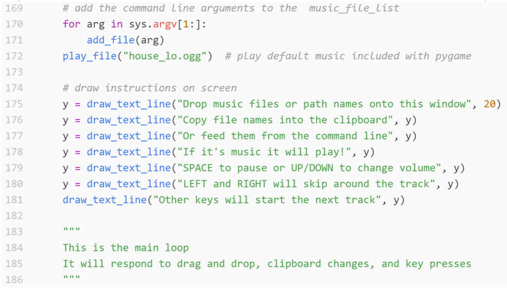From line 170 and 171, the program checks the command line arguments. Command line arguments are those values that are passed during calling of the program through command line shell application. Python provides various ways of dealing with these types of arguments. One common way is to use sys.argv, which is a simple list structure. The first element of the list sys.argv() is the name of the program itself. “sys.argv[1:]” contains all the music files passed in the command line and the program adds each of them at line 171.