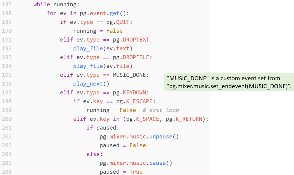 A third special event type is MUSIC_DONE. If you have read part 1 post for this project, you will notice that the program defines a custom event type “MUSIC_DONE” in line 137. It also calls “pg.mixer.music.set_endevent (MUSIC_DONE)” in both “play_file” and “play_next” functions to hook the event type “MUSIC_DONE” with the music end event. Therefore, when a music file finishes playing, event type “MUSIC_DONE” is triggered.