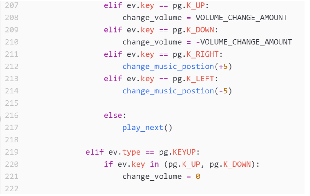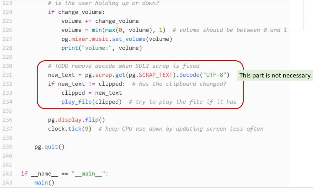 From line 223 to line 228, the program adjusts the volume of the current music file. From line 230 to line 235, the program calls “pg.scrap.get()” method to get the text in the clipboard and checks if there is any change from the previous text. The purpose is to play the music file stored on the clipboard. However, I am using Windows 10 and could not verify this function, so just ignore this part.