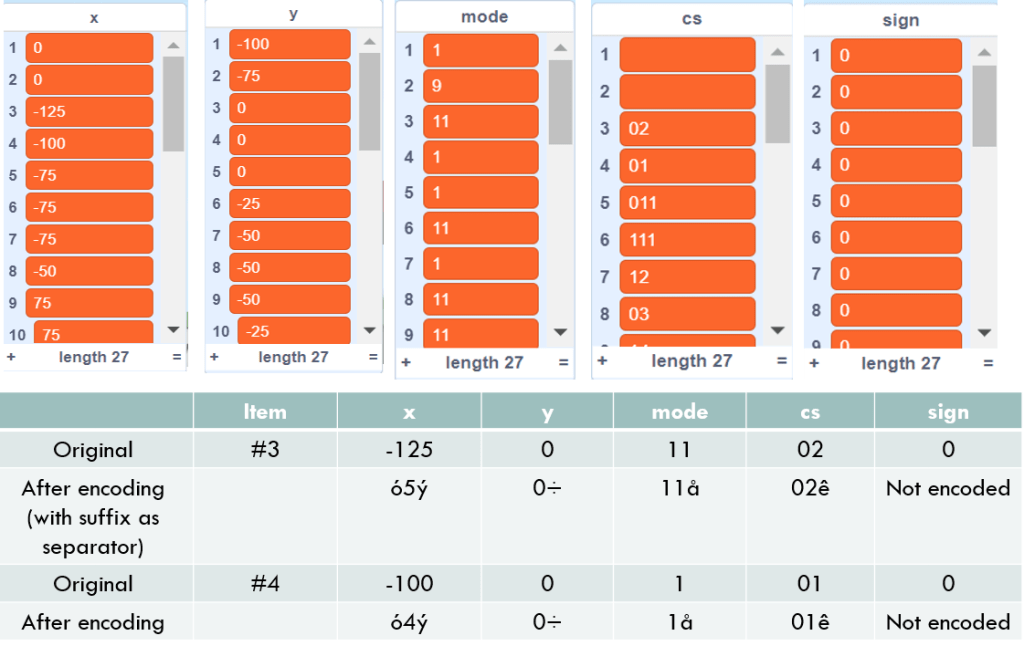 Encoding the item at the same index from lists “x”, “y”, “mode”, “cs” and “sign”, we will get result “Γ³5Γ½0Γ·11Γ₯02Γͺ”. Encoding items one by one and concatinating all the data together, we will finally get the output result. The format of the final output could be like this: