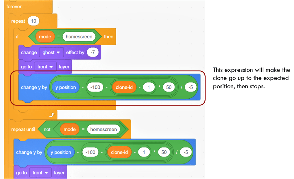The circled code block indicates that each time, the clone changes y by a various amount. So what will be the final y position of the clone button? Its y position will not change any more when the expression is equal to 0. For example, when clone-id is 0, the clone button’s final y position would be (-100), while the second clone button’s final y position would be (-100 – 50) = -150.