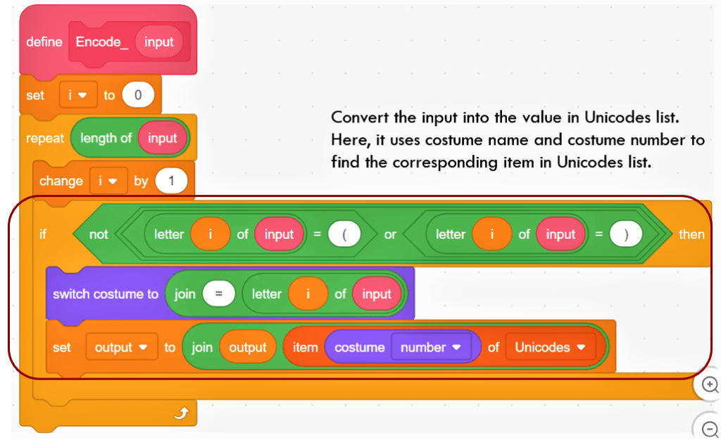 It then switches to show a costume which have the same name of the encoded character. The costume number is used to find the corresponding item in the list “Unicodes”. This could be seen as the second layer of encoding. At the end of each iteration, it updates variable “output” by joining the newly added encoded character.