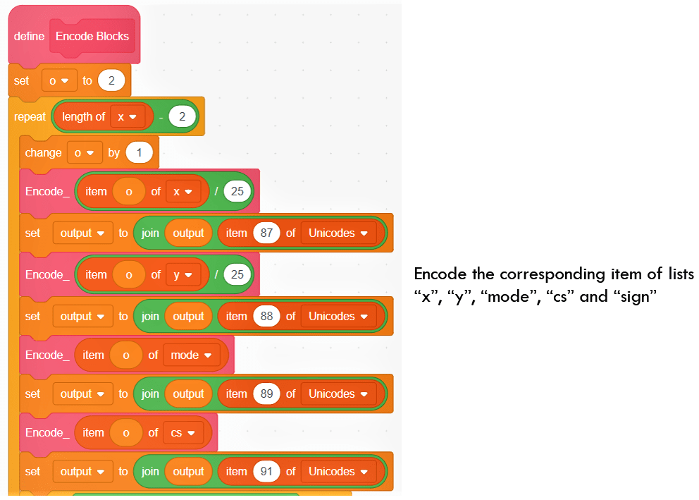 The next block of “Encoder / Decoder” sprite is “Encode Blocks”. It is used to export data of several lists which are all related to the environmental setting. Within this block, the program uses the above block “Encode_” to encode the data of “x”, “y”, “mode”, “cs” and “sign” lists. The “output” string will concatenate each encoded data to form the final result.