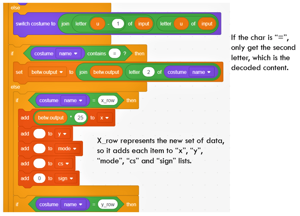 Based on the costume name, the program will check if the costume name contains “=” sign. if it does, the original letter is just normal ones. Then the program just gets the 2nd letter of costume name to retrieve the original number or letter. However, if costume name does not contain “=”, then it is the separator of lists. The program then assigns the value to list item based on the separator name.