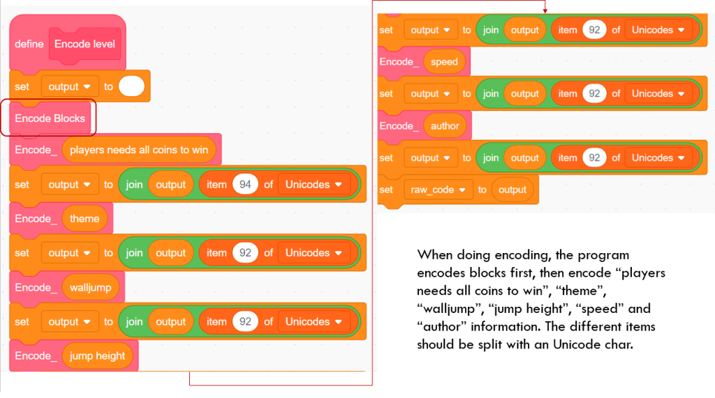 The next block is “Encode level”. It wraps all the encoding procedure. It calls “Encode Blocks” to encode data of “x”, “y”, “mode”, “cs” and “sign” lists. It then encodes several variables which are related to the user settings, such as “players needs all coins to win”, “theme”, “walljump”, “jump height”, “speed”, “author” variables.