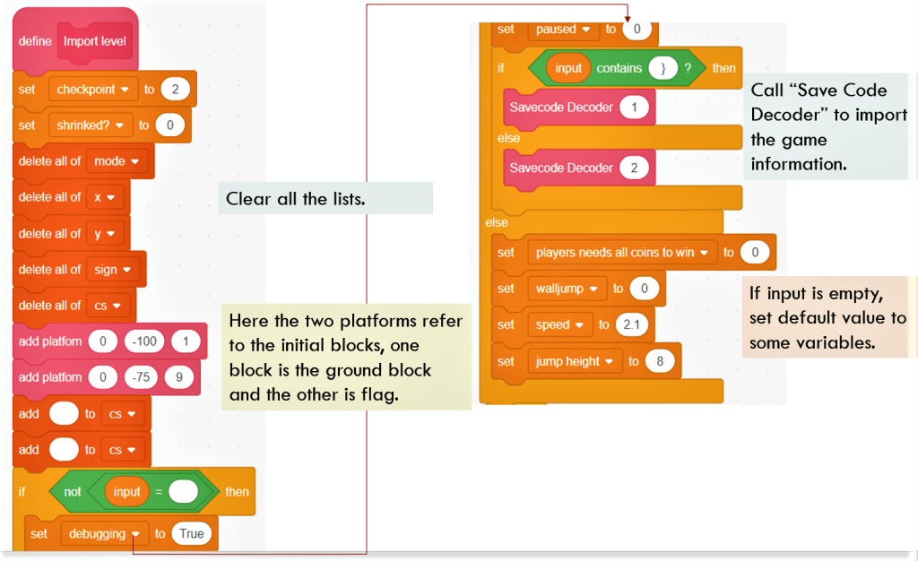 Just as “Encode level”, we need to use a block to call “Decode level”. It is defined in block “Import level” of “Hitbox” sprite . It first sets checkpoint to 2, and deletes all the content in the lists “mode”, “cs”, “x”, “y” and “sign”. Please note that compared to the original version, I add “delete all of cs”, and then add twice of block “add (empty) to cs”. The purpose is to ensure each added item in those lists has consistent index.