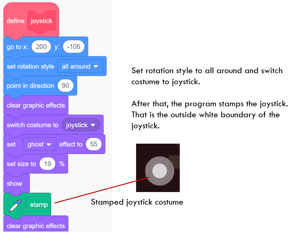 In the above code, the “Stamp” block calls “joystick” block to simulate the operation of joystick. So how to implement this functionality?