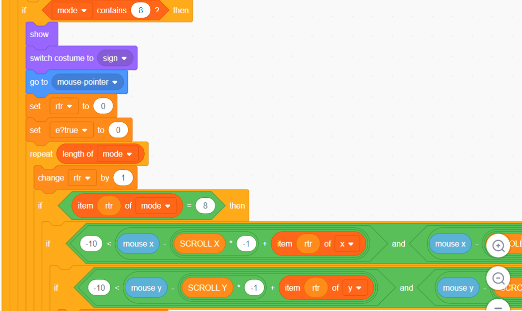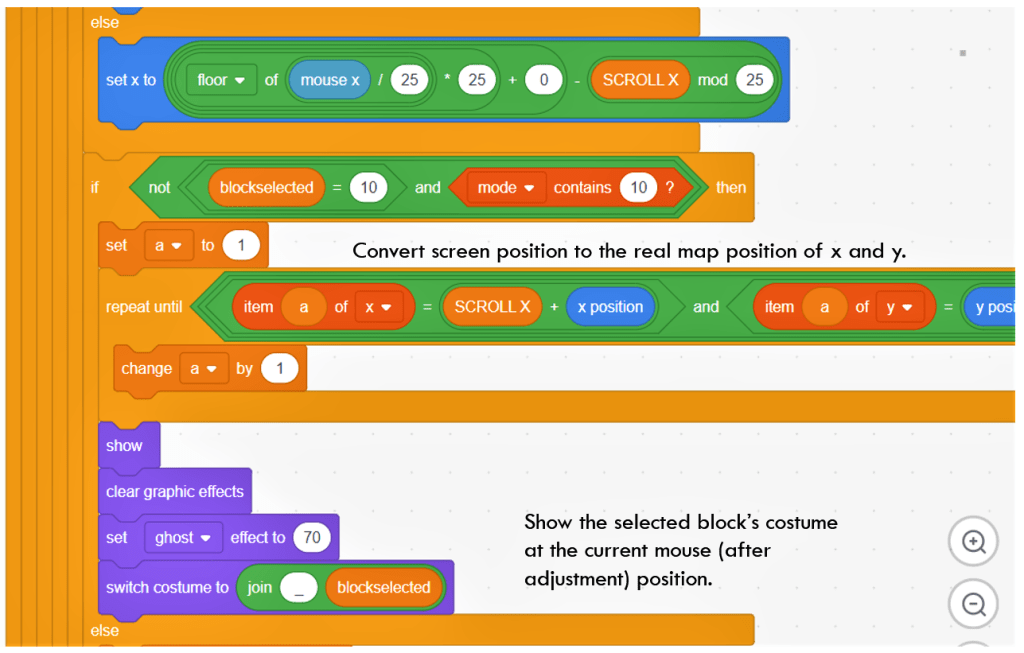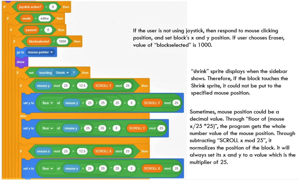 First, the program checks if “joystick active?” variable is equal to 0, “joystick active?” variable is 1 when mouse is pressed down on “joystick” costume. If “joystick active?” variable is 0, it indicates that user is not scrolling the map. It further checks “mode” variable and “paused” variable. When “mode” variable is equal to “editor” and “paused” is equal to 0, the program is going to edit those blocks.