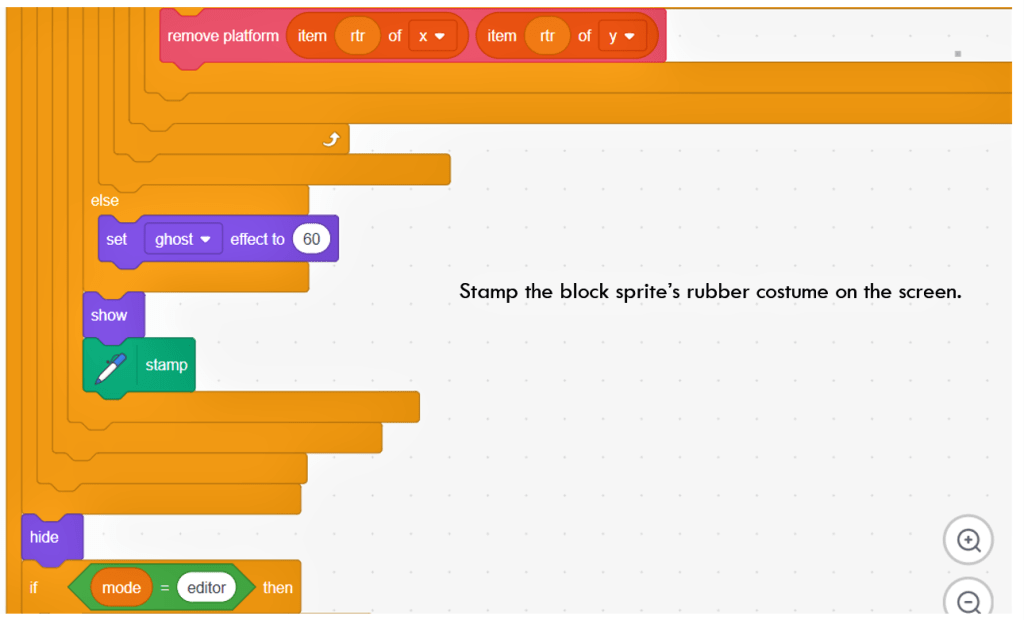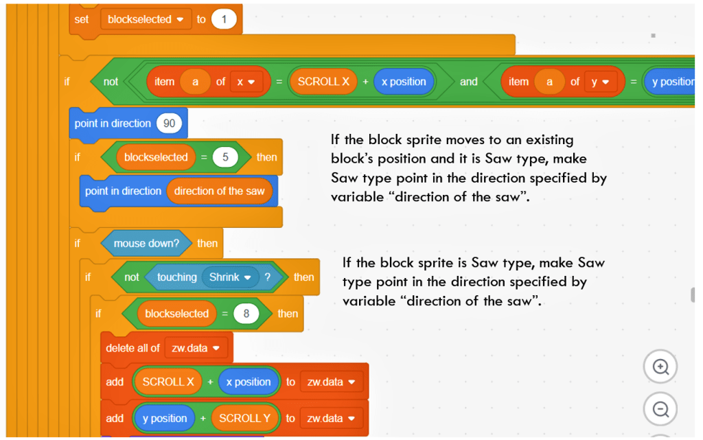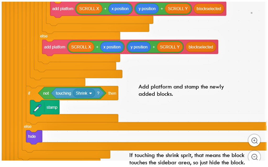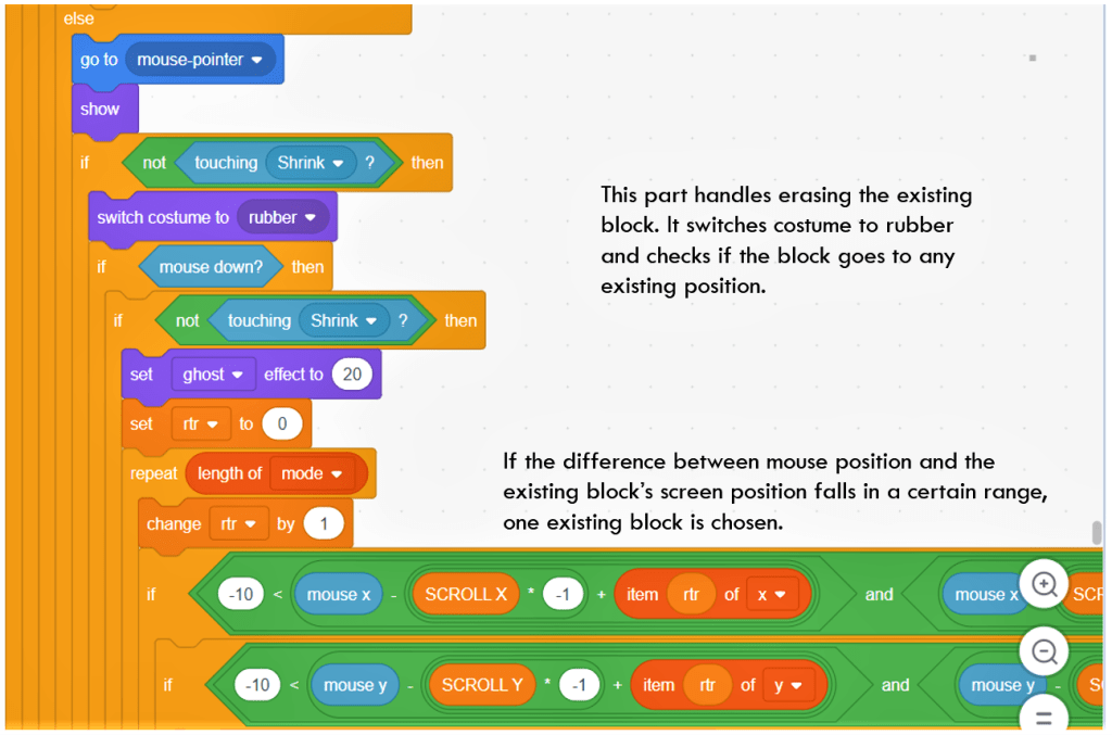 The above code handles “add platform” functionality. However, if blocktype is 1000, it means the current block type is Eraser. It first checks if Eraser block does not touch Shrink sprite. It will then iterate all the existing blocks to check if the current position has any blocks occupied. This checking is done by comparing the value of “mouse x” and “SCROLL X * -1 + (item rtf of x)”, and comparing the value of “mouse y” and “SCROLL Y * (-1) + (item rtf of y)”. If the difference is within a range, it means the current position has block already, and the program calls “remove platform” block to remove it from all the relevant lists.