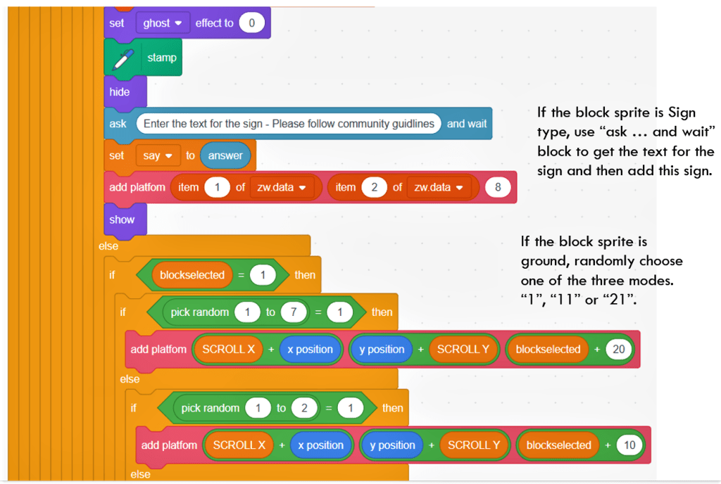 After getting x and y position of the current block, the program checks “if not ((blockselected = 10) and (mode contains 10))”. This line of code is used to judge if success flag has been added into the block lists. Since the whole game allows only one success flag, if “mode” list has contained the value of 10 and “blockselected = 10”, the program will automatically set “blockselected” value to 1, the ground block type. In this way, there will not have two or more success flags in the game.