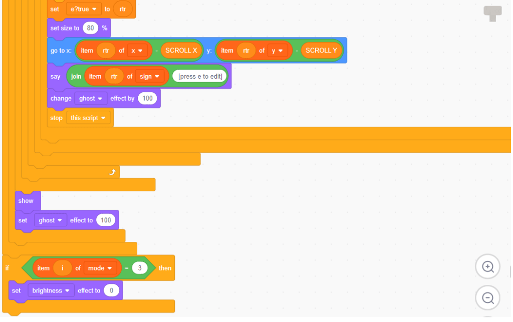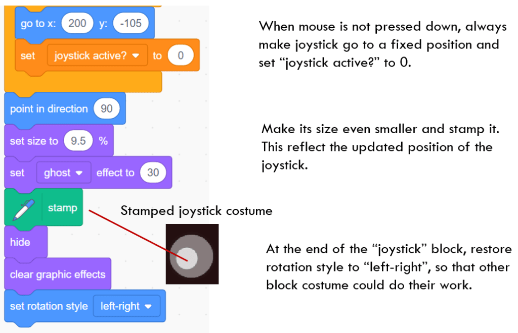 The “joystick” costume is a white round shape, which could respond to mouse pressing event. It is used to scroll the map. At the beginning of the block, the program sets its size to 19% and then stamps to a bottom-right position on the stage.