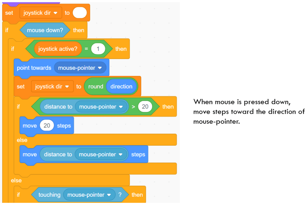 After that, the program checks if mouse is pressed down. If the distance of the Block sprite to mouse pointer is bigger than 20 units, block sprite moves 20 steps toward mouse pointer, otherwise, it moves to the position of mouse pointer directly.