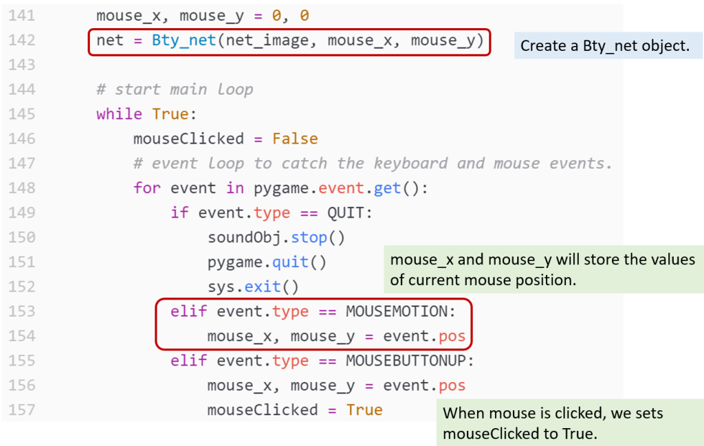 From line 145, the program enters the main loop. It first checks the events to see if any keyboard and mouse events happens. This part is the same as the previous version. When event type is MOUSEMOTION, it represents the mouse movement event. The program will record mouse position to mouse_x and mouse_y. When the event type is MOUSEBUTTONUP, it represents the mouse button release. The program will set variable mouseClicked to True.