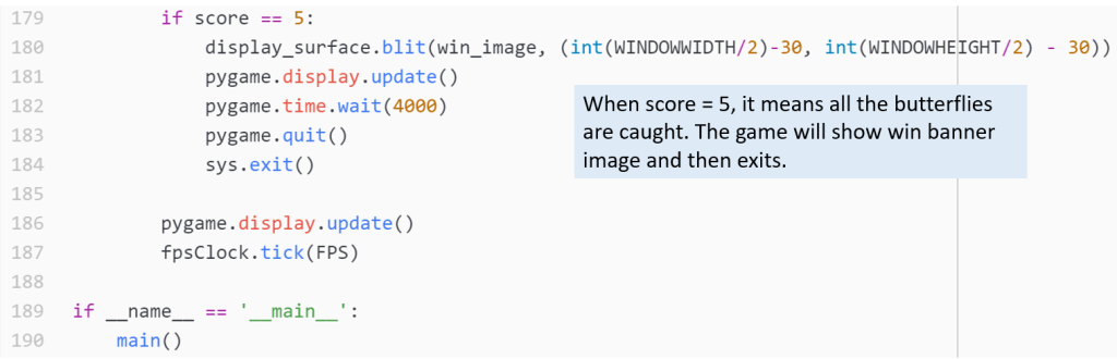 From line 179 to line 184, the program checks if all the Butterfly objects get caught. If that is the case, the program blits the win banner image to display_surface, and then exits the program.
