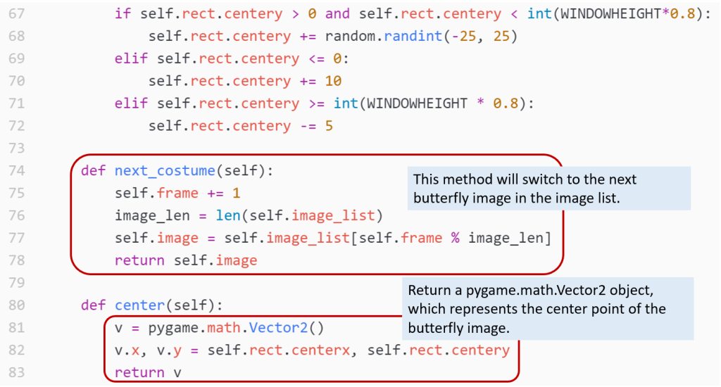 At line 74, the program defines a method called “next_costume”. This method changes butterfly image to the next one in butterfly_image list. The attribute self.frame is used as a counter. Through using “self.frame % image_len”, self.image will iterate the item in self.image_list repeatedly, making butterfly object change images periodically.