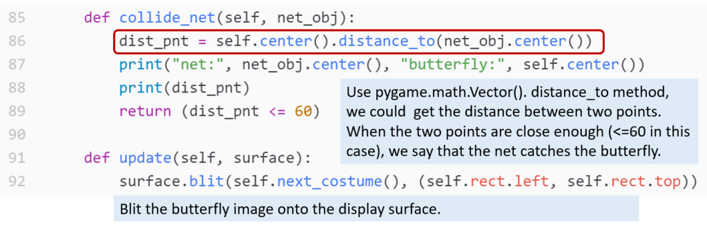 At line 85, the program defines a method called “collide_net”. This method is used to check if a butterfly object collides with net object. When we say a butterfly is caught by a net, it is not that the butterfly object just touches the net. Instead, the butterfly object should be within the net part. use pygame.math.Vector().distance_to method, we could get the distance between two Vector2 objects. When the distance is small enough (<=60 in this case), we say that the net catches the butterfly.