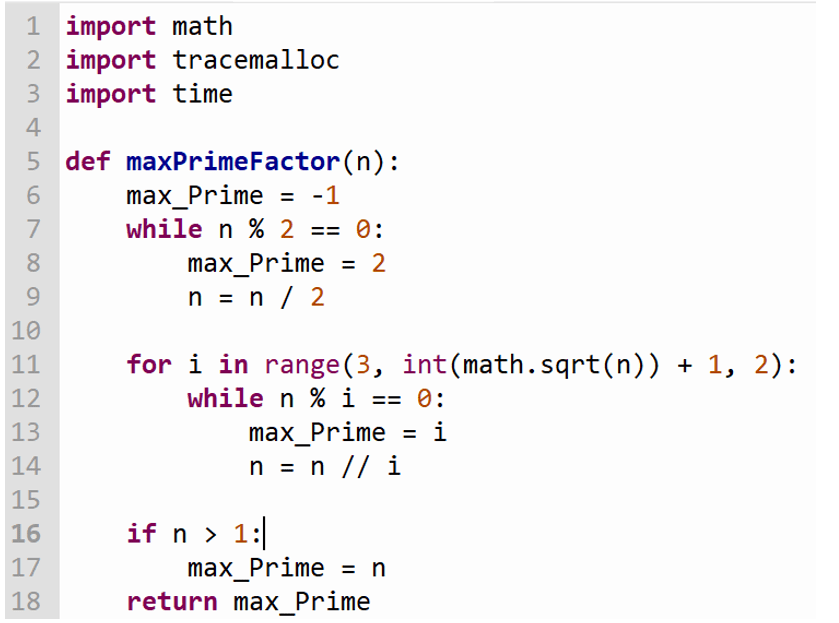 Recently, I am teaching students algorithm using Python. One question is to find maximum prime factor of a given number. When we consider algorithm, we should consider both the running time and occupied memory of the program when the input is an extremely big number.