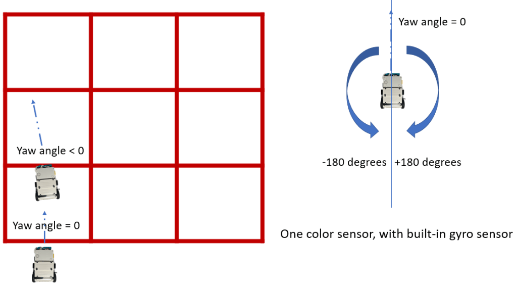 I am not planning to introduce the built-in gyro sensor in this post. Just briefly introducing the roll, pitch and yaw angle used in the gyro sensor. In this model, since the smart hub is having its front surface facing up, when the vehicle turns, the yaw angle will change accordingly. As the following diagram shows, when the smart hub turns right, yaw angle increases. When the smart hub turns left, yaw angle decreases. The yaw angle always changes between -180 and 180. If we set the starting direction as yaw angle 0 by calling block “set yaw angle to 0”, we could adjust its direction by referring to the original yaw angle 0, so as the robot could correct its deviation and keep its correct direction.