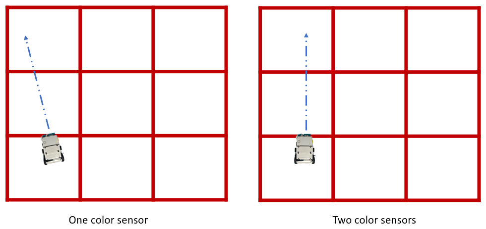 To solve the direction control issue, the most convenient method is to use two color sensors, mounted symmetrically on the vehicle. Whenver identifying a grid line, both color sensors should identify the line. If you have two color sensors, you could use this solution. However, since the LEGO MindStorms Inventor set only contains one color sensor by default, we need to seek help from the built-in gyro sensor of the smart hub.