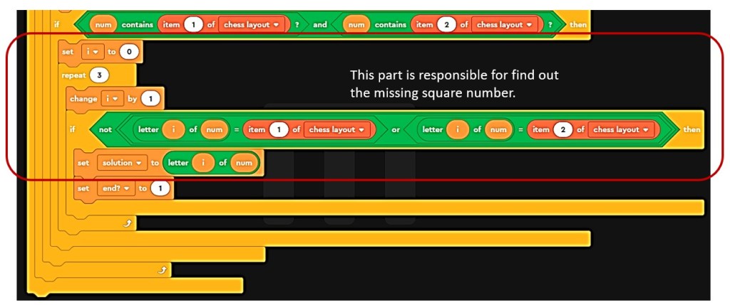 First, the program checks how many squares are marked. When there are less than two marked squares, it indicates that there is no solution for this game, so we keep solution variable to 0, representing “no solution”. When there are two marked squares, the program enters a loop to check if marked square numbers are included in any predefined solutions. For example, the recorded square number 1 and 5 could be found in the predefined solution “159”, the program only needs to find the missing number “9” and then store it to the variable “solution”.
