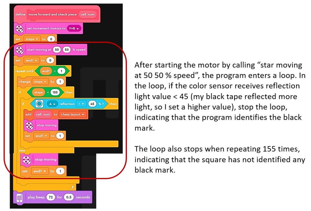 Once the robot reaches the grid line and aligns itself well, it could move forward to check the black mark in the square. However, what if the square has not the black mark? After looping for certain times without identifying any black mark, the program will stop the loop and believe that the square has not black mark, then the program runs forward to identify the next grid line. Sample code is provided for your reference.