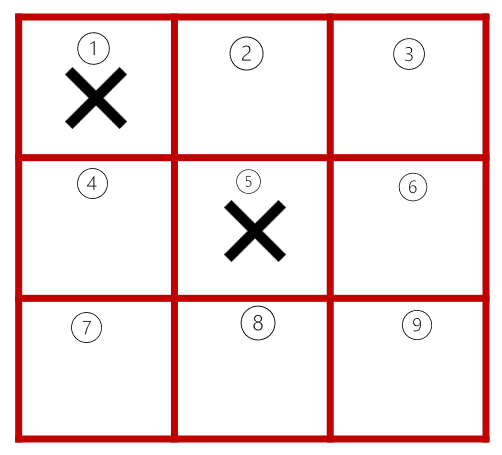 When scanning the whole grid, the robot needs to check which square has the black mark. After scanning, the robot needs to record the mark’s position. For example, in the following diagram, square 1 and square 5 have black marks, so the robot needs to record “1” and “5” in a list, let’s call it “chess layout”.