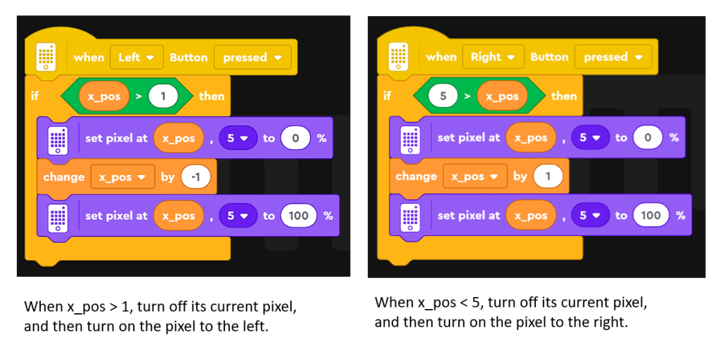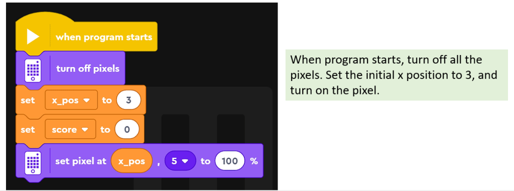 In the above code segment, when program starts, turn off all the pixels on the screen. “x_pos” variable is used to set the initial x position of the user controlled pixel. Its initial value is set to 3, representing the third column. Initial score is 0, which is apparent. At the last line of the code segment, the program sets the user defined pixel to light 100%. Please note that in the block “set pixel at __, __ to 100%”, the first blank refers to the x position, or represents the column 1 to 5 (the leftest column is 1), while the second blank refers to the y position, or represents the rows 1-5 (the uppermost row is 1).