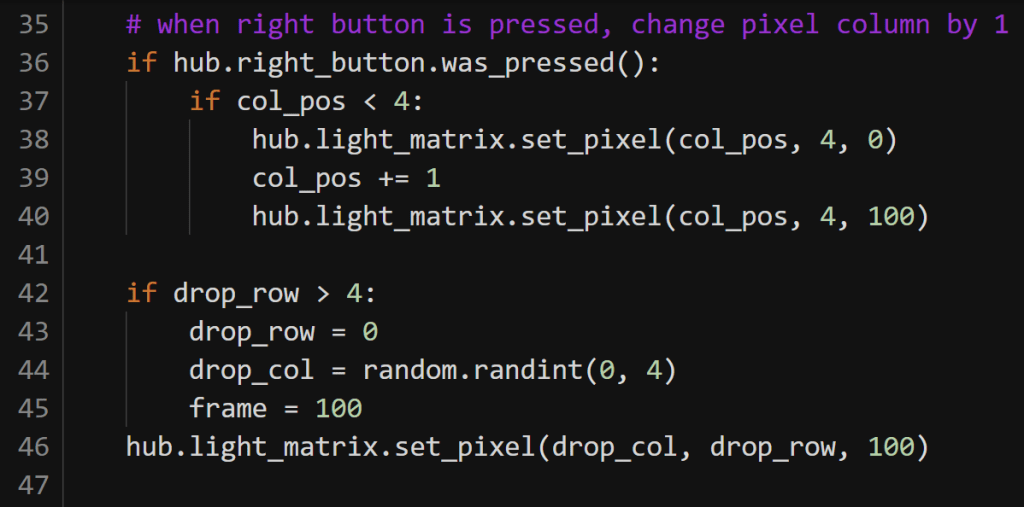 Here, we also need to create a loop called “while game_over == False”, which includes all the tasks of the game. Within this loop, first, we check if the left button or right button is pressed. If left or right button is pressed, we need to switch off the pixel at the current position, change col_pos and then switch on the pixel at the new position. This functionality is implemented from line 29 to line 40.