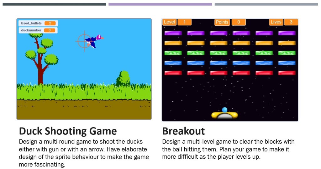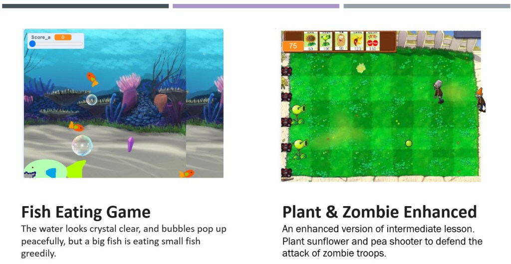 As its name says, Advanced Level courses are specifically designed for students to advance their Scratch programming skills. Students have learned Scratch programming in a systematical way and there is no problem for them to design a project independently. What they need is to sharpen their programming skills and learn how to design more advanced projects, such as scrolling platformer game, puzzle game, multi-level games, etc.